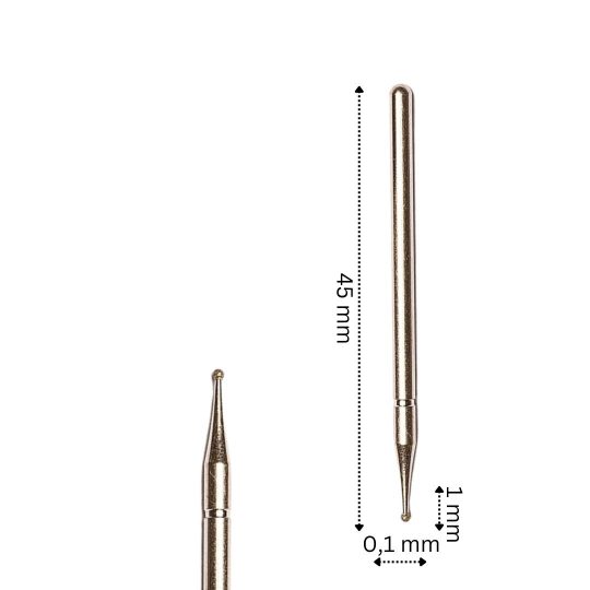 Cap de freza pentru cuticule, tip bila mica, realizat exclusiv din carbura metalica diamantata, avand o rezistenta ridicata si granulatie fina. Special creat pentru indepartarea cuticulelor si obtinerea unei manichiuri perfect finisate, fara a provoca leziuni la baza unghiei. Datorita suprafetei diamantate, indepartarea straturilor inestetice se realizeaza fara a provoca leziuni la nivelul pielii.